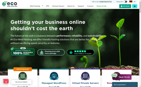Eco Web Hosting focuses on fast and eco-friendly website hosting. We've built a powerful hosting platform designed for optimal speed and performance as well as constantly work to reduce our environmental impact, with trees planted for each package purchased. Find us on Twitter at @ecowebhostinguk, Facebook at EcoWebHostingUK, or call us on 0330 043 0712.